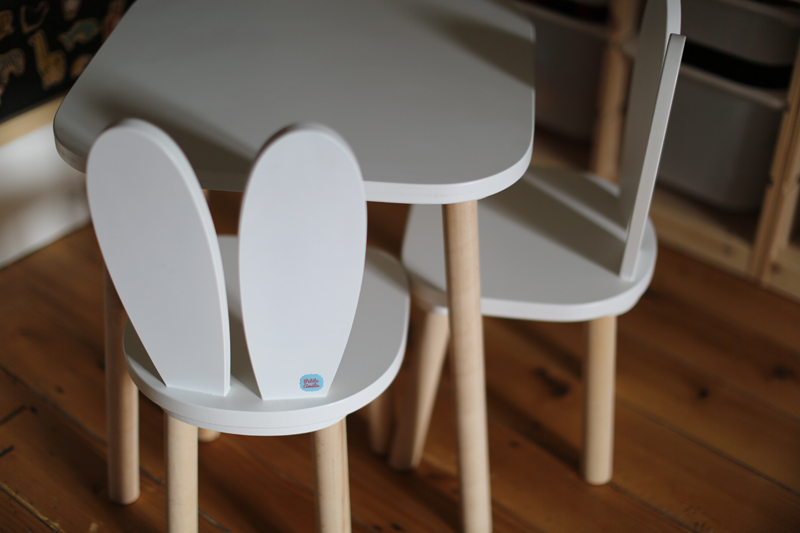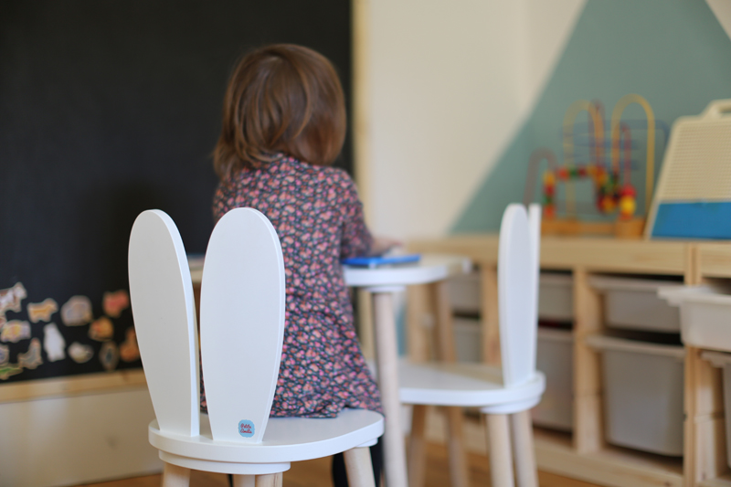 Dans une salle de jeux on peut également trouver un espace en hauteur pour dessiner, faire des puzzles, des jeux. J’ai totalement craqué pour cet ensemble table et petites chaises à oreilles de lapin. Craquant à souhait! Il s’agit de la marque Petite Amélie, création artisanale en Europe, une entreprise qui favorise les matériaux durables et de qualité. Pour info mon fils de 5 ans s’assied encore très bien sur cette petite chaise enfant, je pense qu’elles peuvent être utilisées jusqu’à l’âge de 6/7 ans selon la taille de l’enfant.