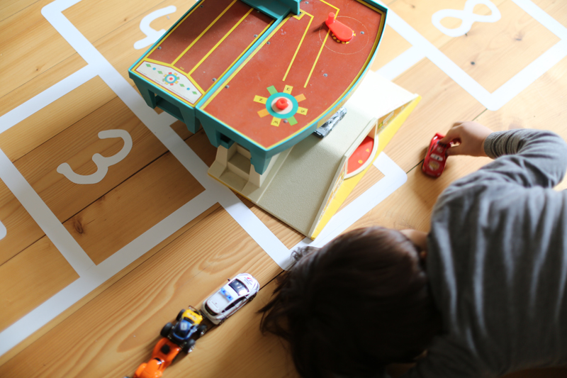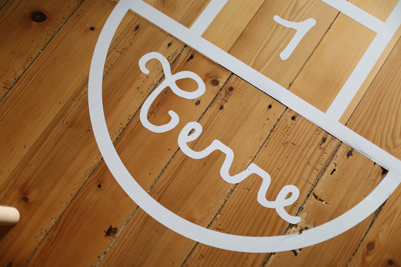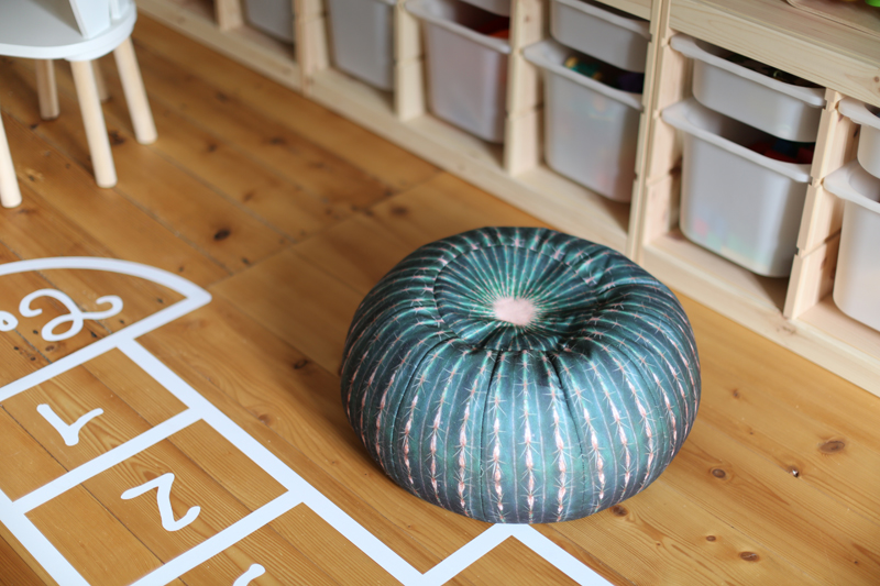 Au sol une marelle! J’avais vu cette marelle lors d’une présentation presse et j’avais retenu l’idée pour une chambre d’enfant mais au final dans la salle de jeu c’est encore mieux! C’est un sticker collé au sol, il a résisté à la fête d’anniversaire de mon fils, donc pour le moment j’en suis ravie. A vous la marouflette! Il existe une version pochoir sur le même site, à voir avec le temps si je saute le pas pour la peintre à plus long terme sur le sol. Vous pouvez aussi personnaliser votre marelle, c’est plutôt cool comme idée déco.