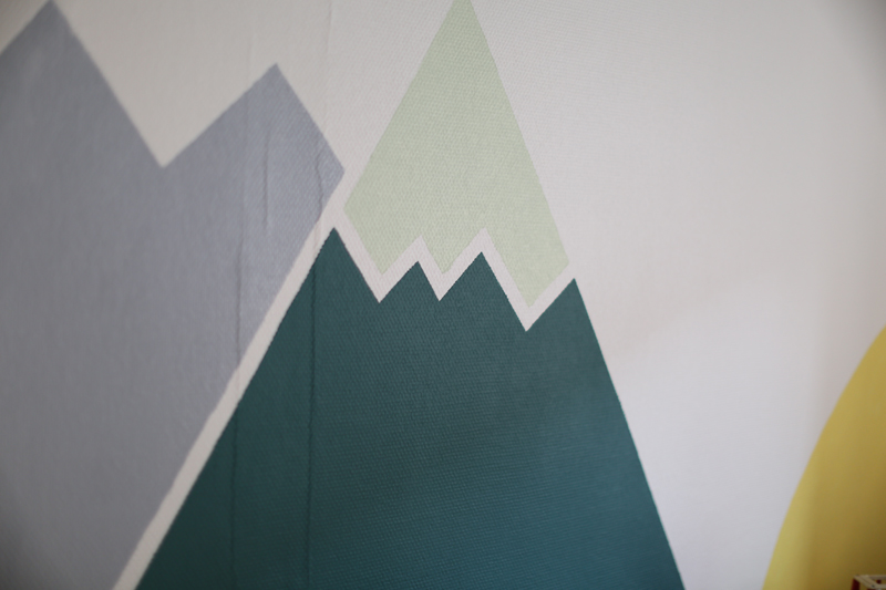 Je n’avais pas envie d’une grande étendue de mur neutre de couleur, mais plutôt de motifs sans faire trop chargé alors j’ai eu l’idée de faire des grandes montagnes et son soleil dans un style assez graphique.