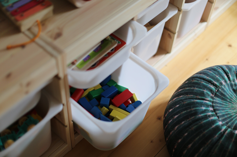 Côté rangement, j’ai beaucoup cherché sur la toile une solution pour accueillir tous ces petits jouets qui se perdent et se mélangent facilement. Je voulais également quelque chose de facile d’accès pour mes enfants afin qu’ils puissent aussi acquérir le réflexion du rangement. Et je n’ai pas trouvé mieux que les meubles « Trofast » Ikea avec leurs bacs amovibles. Ils existent dans plusieurs couleurs et finitions, perso j’ai choisi quelque chose de neutre, du pin et des bacs blancs.