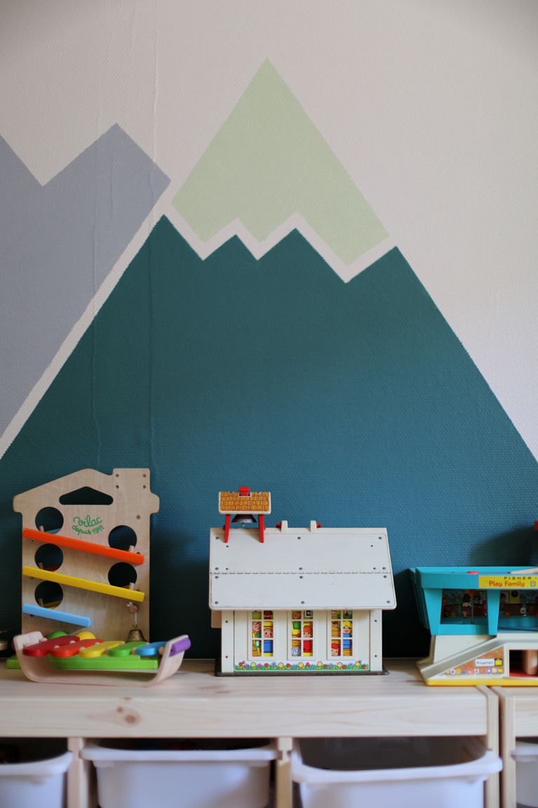 J’ai choisi des teintes universelles, qui puissent convenir pour mes deux enfants, quelque chose de joyeux. Les montagnes habillent très bien ce mur sans pour autant en faire une décoration très chargée. Mes enfants étaient ravis lorsqu’ils ont découvert le résultat. Mon fils m’a juste dit que j’aurai pu faire des rayons à mon soleil! Trop mignon!