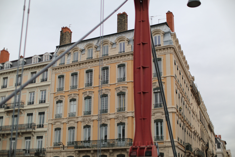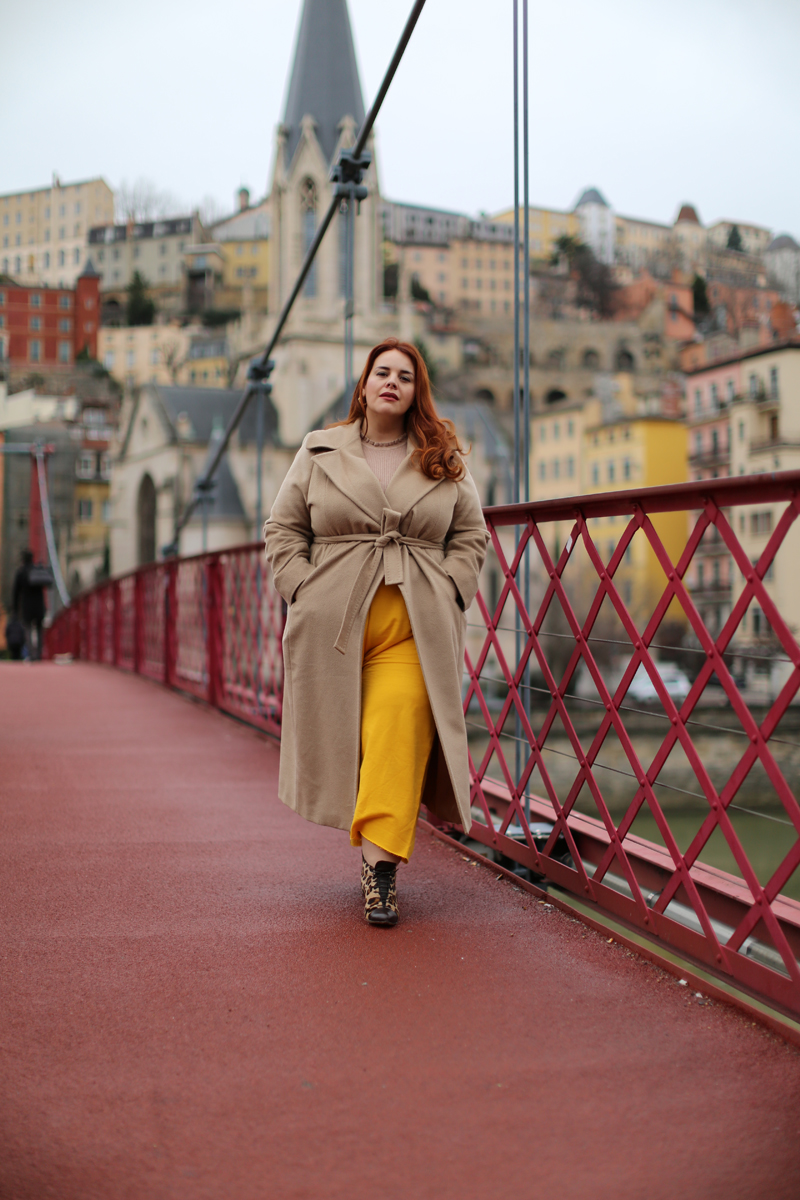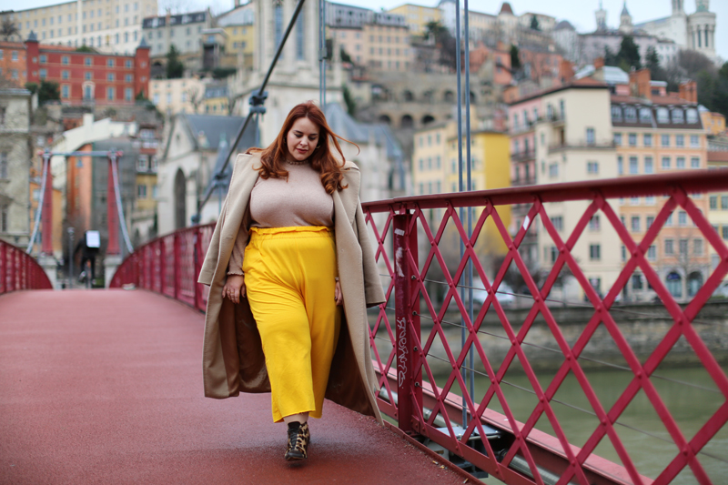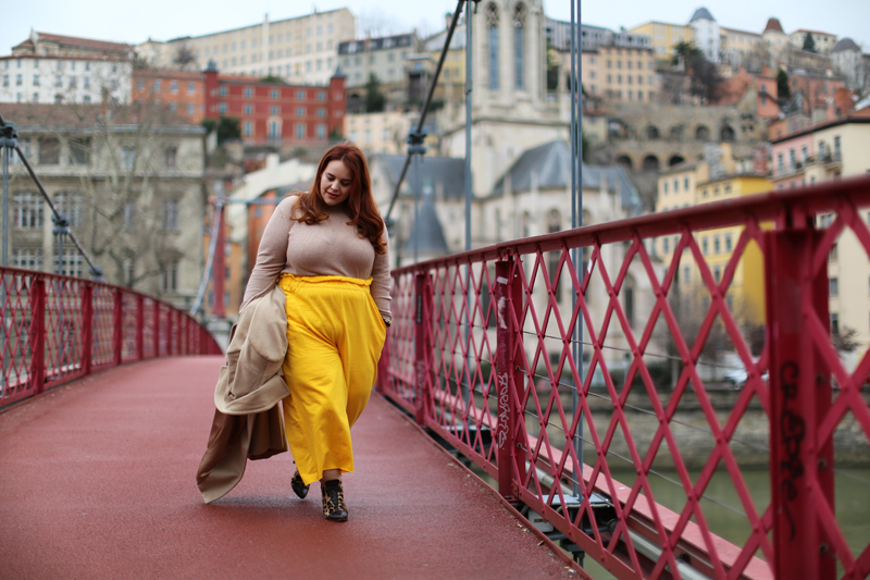 Entre le roux des cheveux et le jaune solaire du pantalon on est pile raccord avec les tons des immeubles du quartier ! Trop classe! En tant que lyonnaise ravie de voir sans doute un des plus jolis coins de ma bonne ville. Si tu peux pourquoi ne pas exploiter aussi ces ponts et passerelles illuminés le soir? C’est très beau. Je te conseille aussi un petit tour sur l’île Barbe quand il fera beau, tes enfants devraient aimer ce coin vert et mystérieux de Lyon et les bâtiments anciens font un beau décor pour un futur shopping! En plus on peut manger grenouilles et friture dans des guinguette au bord de l’eau.