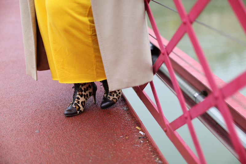 Pour l’assagir je lui associé à des couleurs neutres, avec juste ce qu’il faut de peps et de relief avec les chaussures.