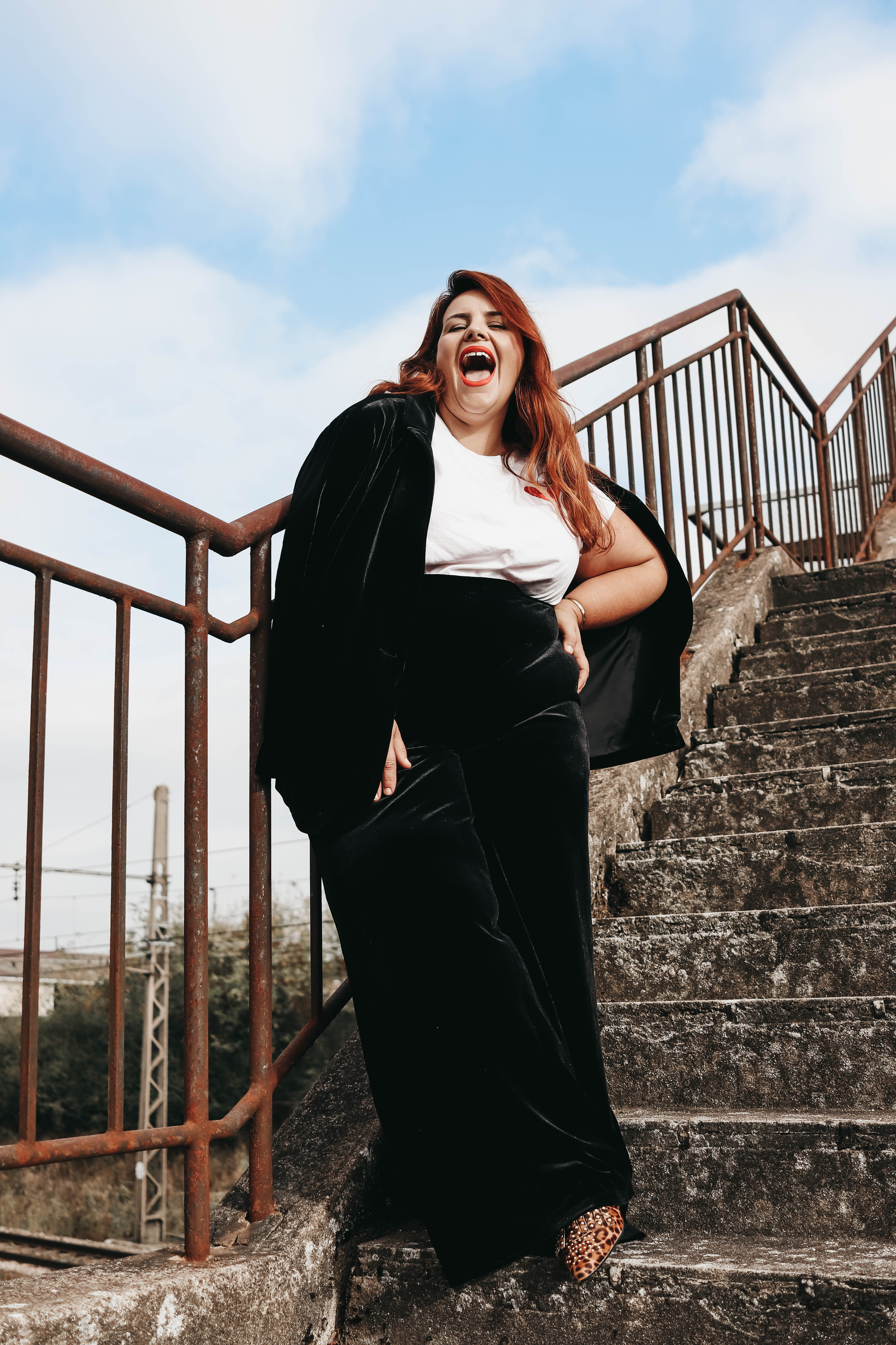Une petite anecdote marrante, avec Eva ma photographe nous cherchions un lieu de shooting dans une usine en démolition, un mec s’est approché de nous en me filant une belle frousse au passage, car il nous a pris pour des voleuses de matériaux de chantier. J’ai répondu au gars, vous avez déjà vu des voleurs en smoking en velours en pleine journée? Ce à quoi il m’a répondu « l’habit ne fait pas le moine » ! Nous étions mortes de rire, comme quoi, overdressed en journée ça passe très bien dans n’importe quel job! ^^