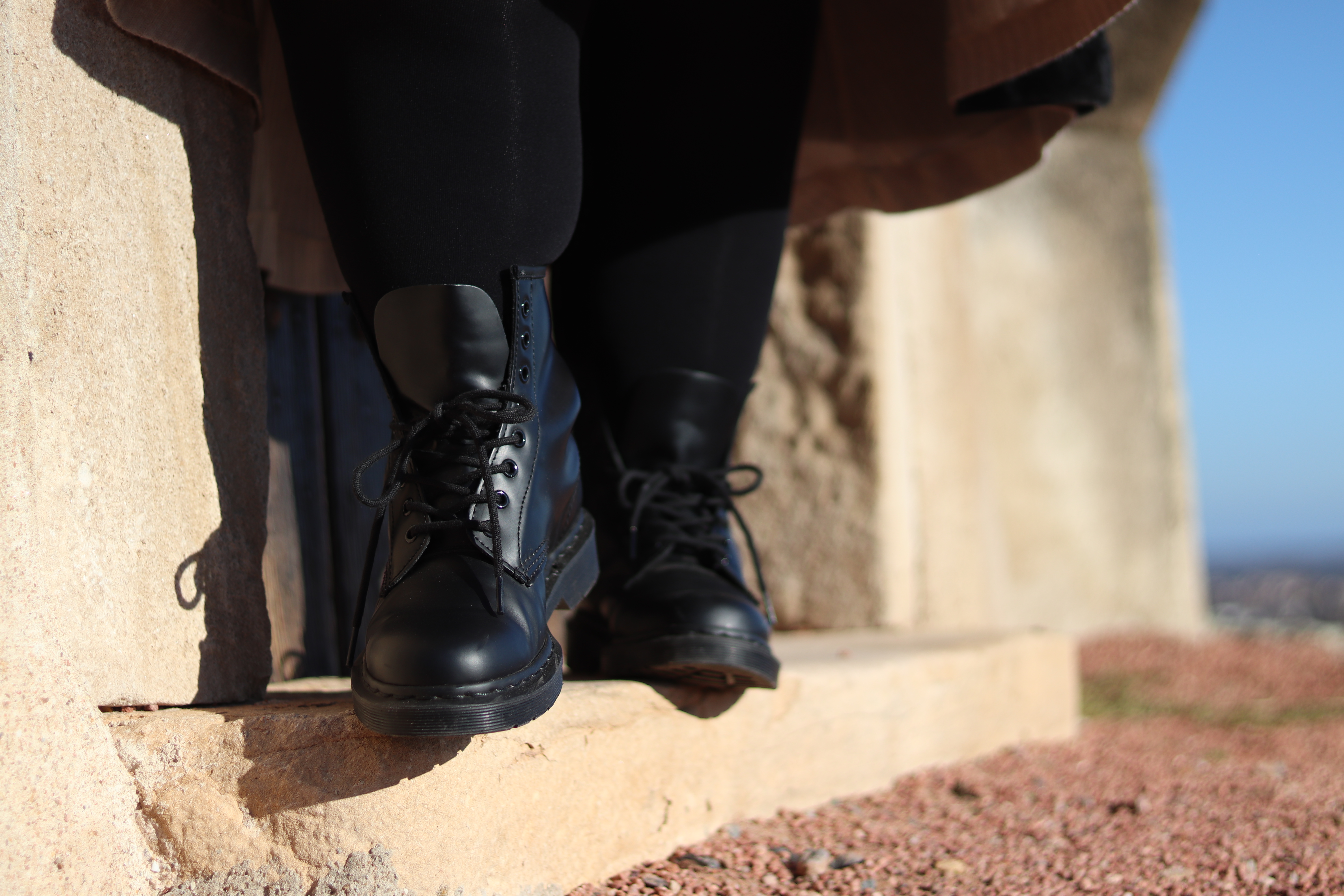 A mes pieds mes Doc Martens. J’en possède déjà deux paires, mais des modèles bas et colorés, j’avais envie de dénicher une paire de bottines hautes et j’ai eu beaucoup de peine à me décider sur la couleur et la pointure. J’ai entendu tout et son contraire, ça taille petit, grand, prendre 2 pointures au dessus pour y glisser une chaussette. Bref j’ai fini par prendre ma pointure et c’est très bien comme ça. En réalité je fais un 39,5 et mes boots sont en 40. J’ai choisi de ne pas les lasser jusqu’en haut de toute façon c’est beaucoup trop rigide au début pour espérer les monter plus haut. Après plusieurs jours déjà j’ai senti une différence sur le cuir. Ma version de 1460 est monochrome et je peux choisir de laisser vieillir le cuir ainsi ou alors le cirer. Je peux aussi simplement le cirer à l’avant comme une coque si connue chez Doc Martens. Pour le moment je les laisse ainsi, j’aime le fait qu’elles sont complètement noires, pas de ligne jaune, ou fil de couture contrasté. Non all black, c’est parfait!
