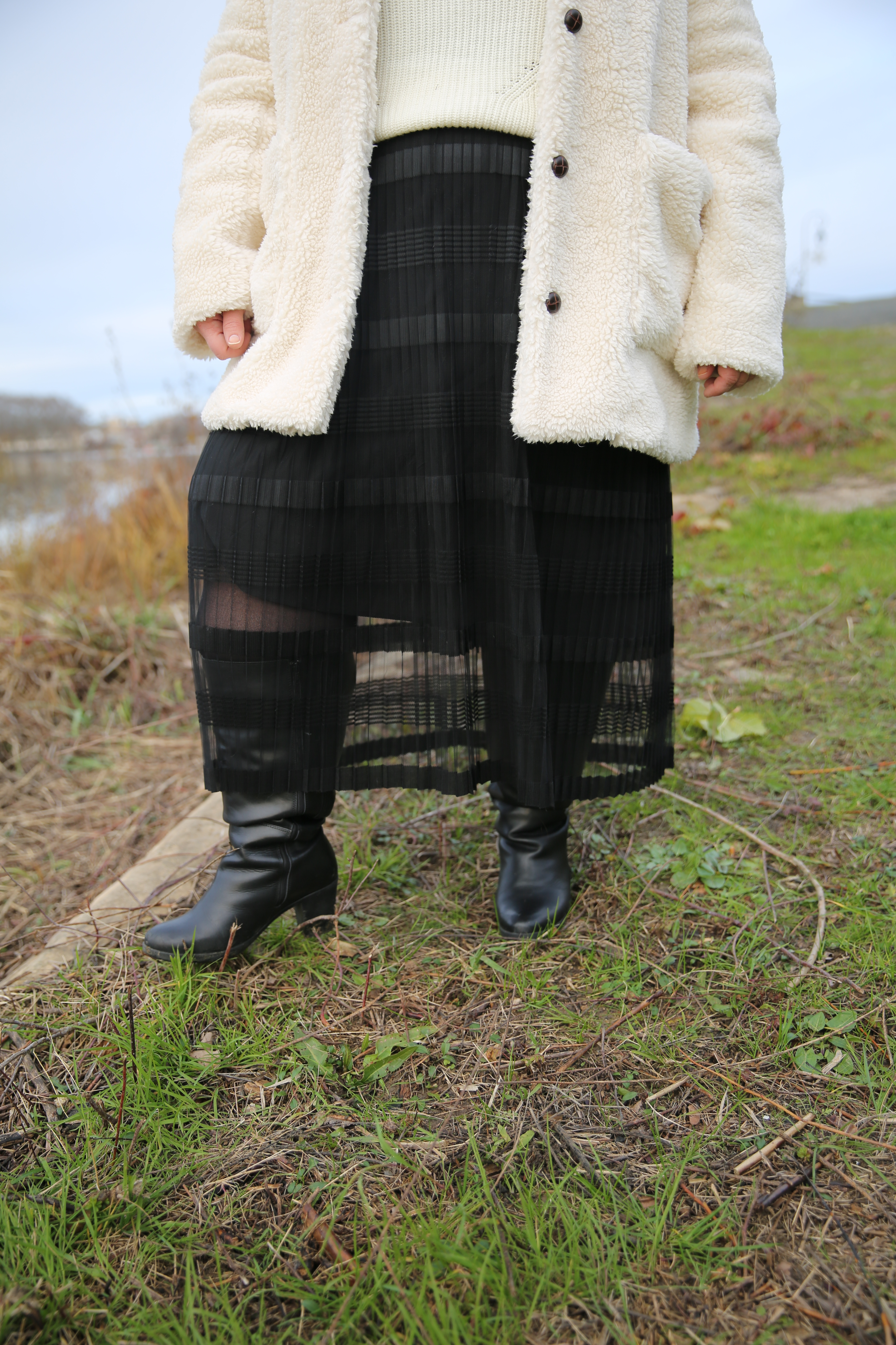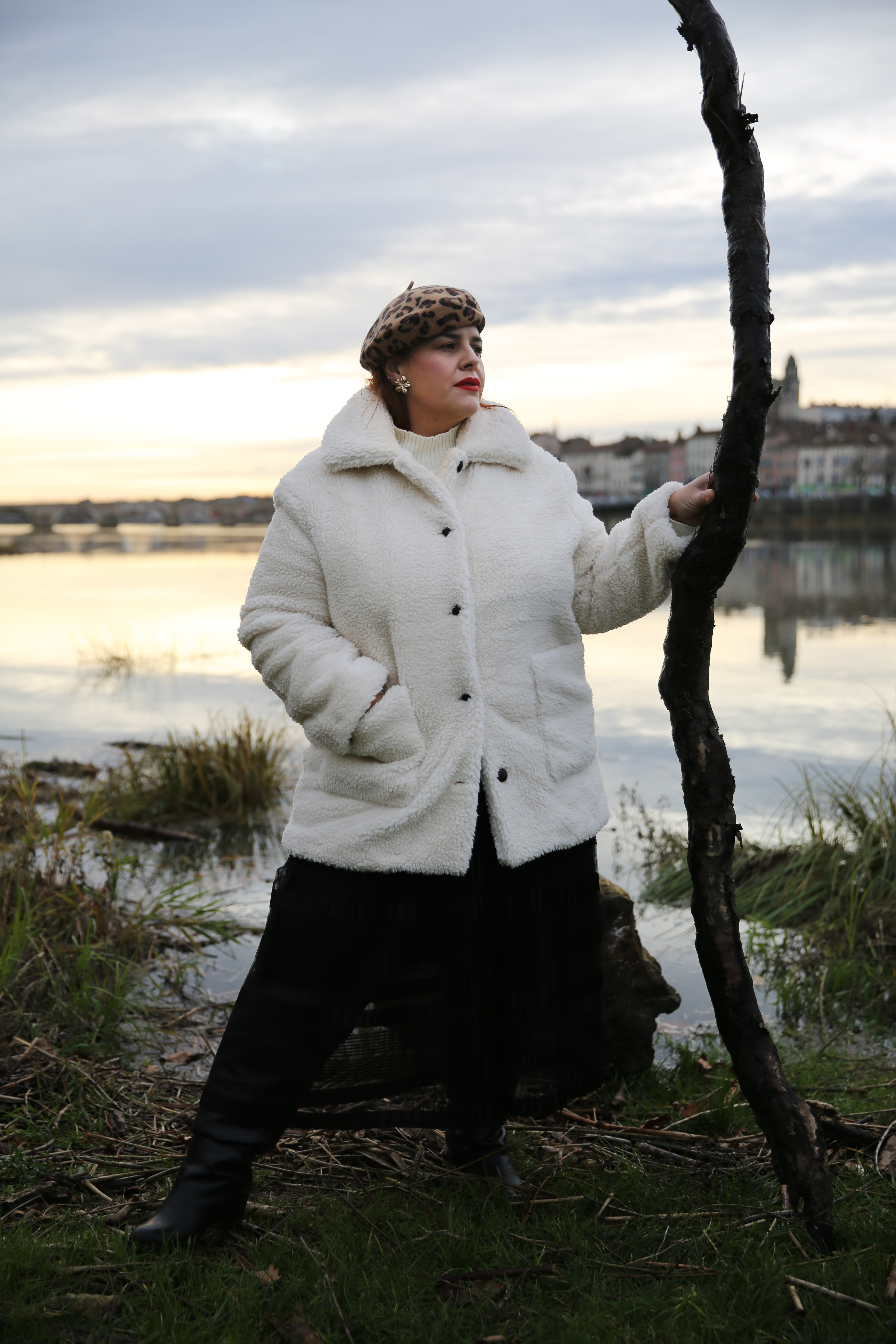 Côté tailles car je sais que vous aimez savoir ce que j’ai pris. Le manteau est une taille 50, il taille très bien pour porter un gros pull en-dessous. La jupe en taille 50 également et elle est dispo jusqu’au 52.