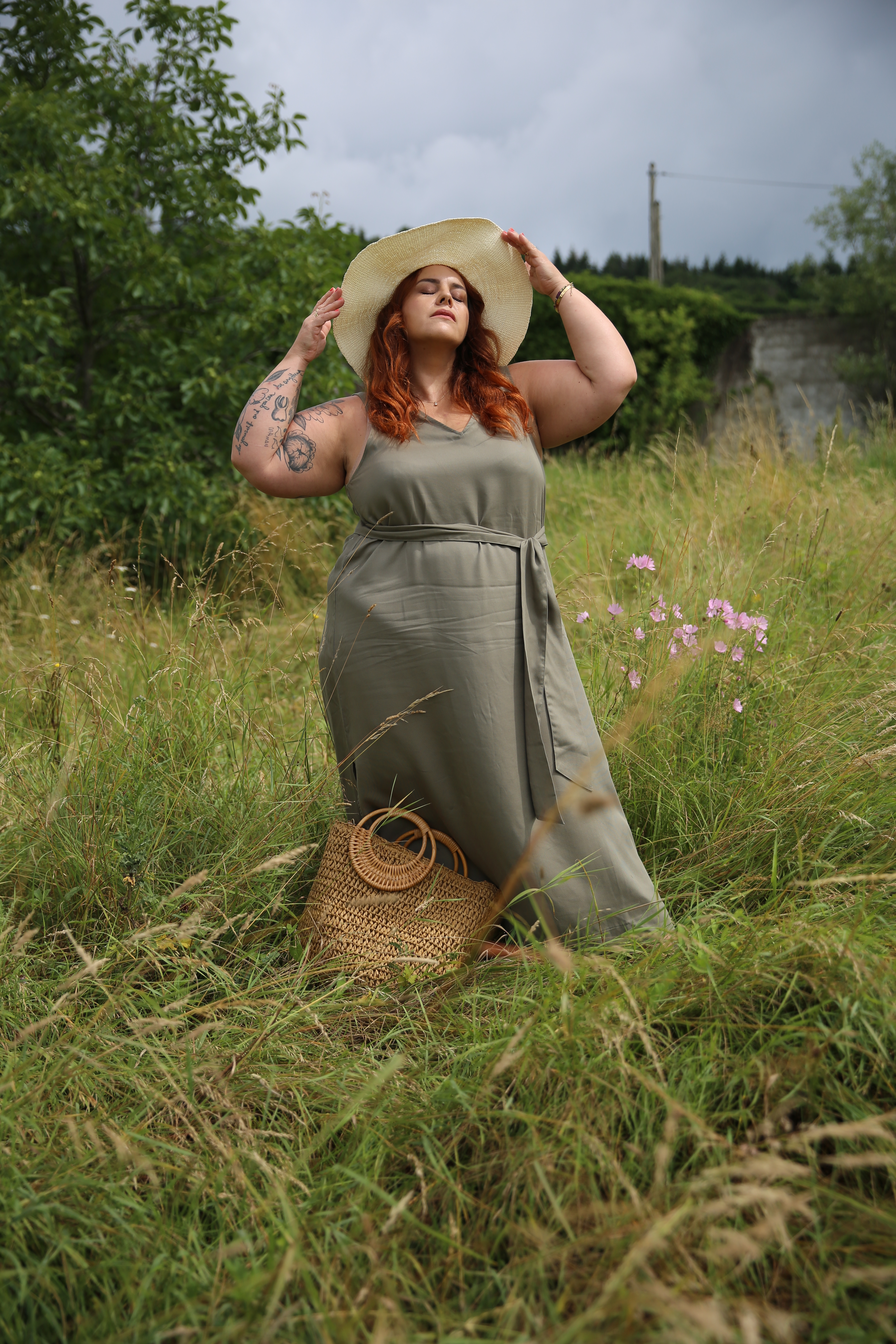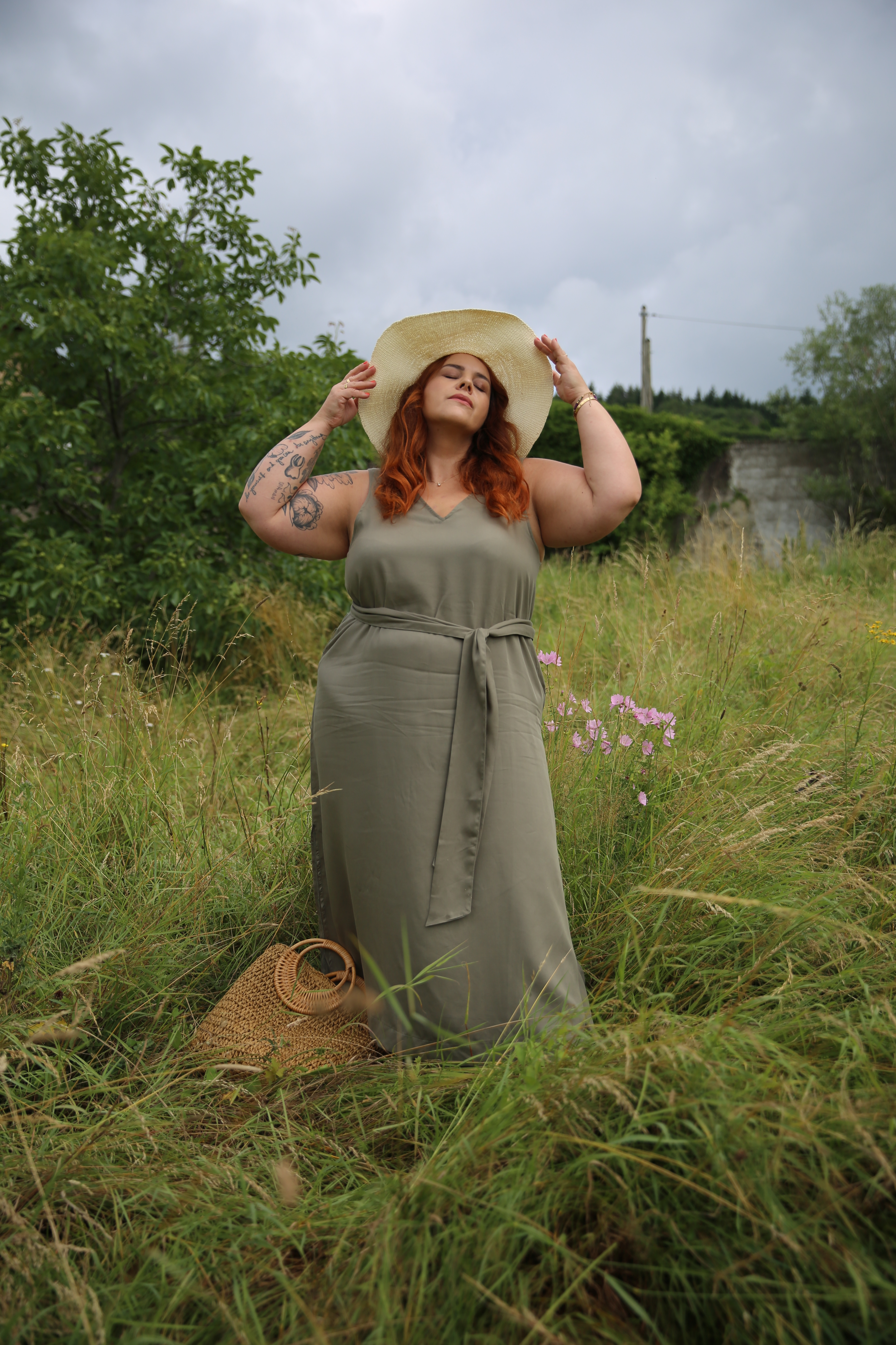 J’adore ton look avec la robe verte et le grand chapeau je pensais qu’elle était en lin,.