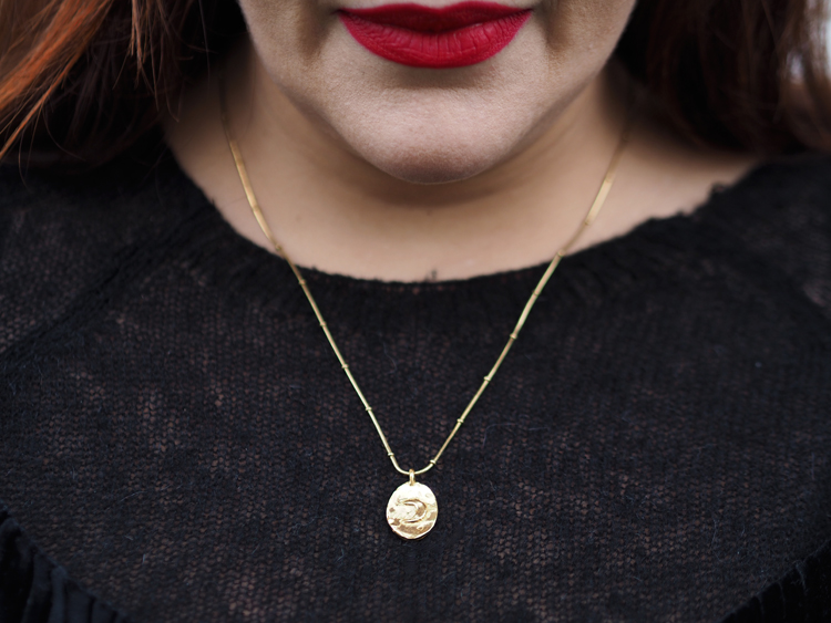 J’aime beaucoup ta tenue et je trouve que le petit pendentif ( avec une lune dessus?) ressort bien sur ton pull, très élégant!