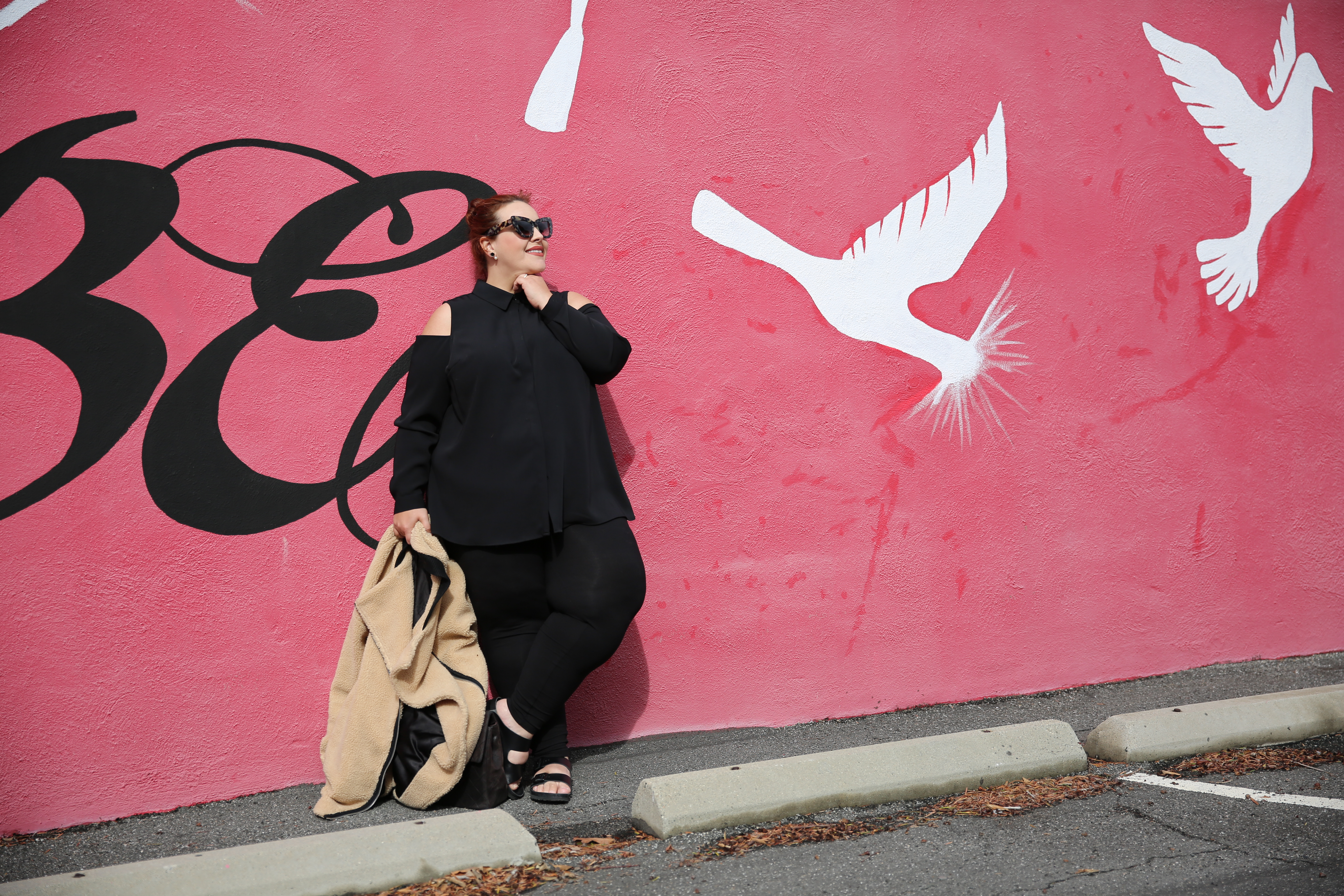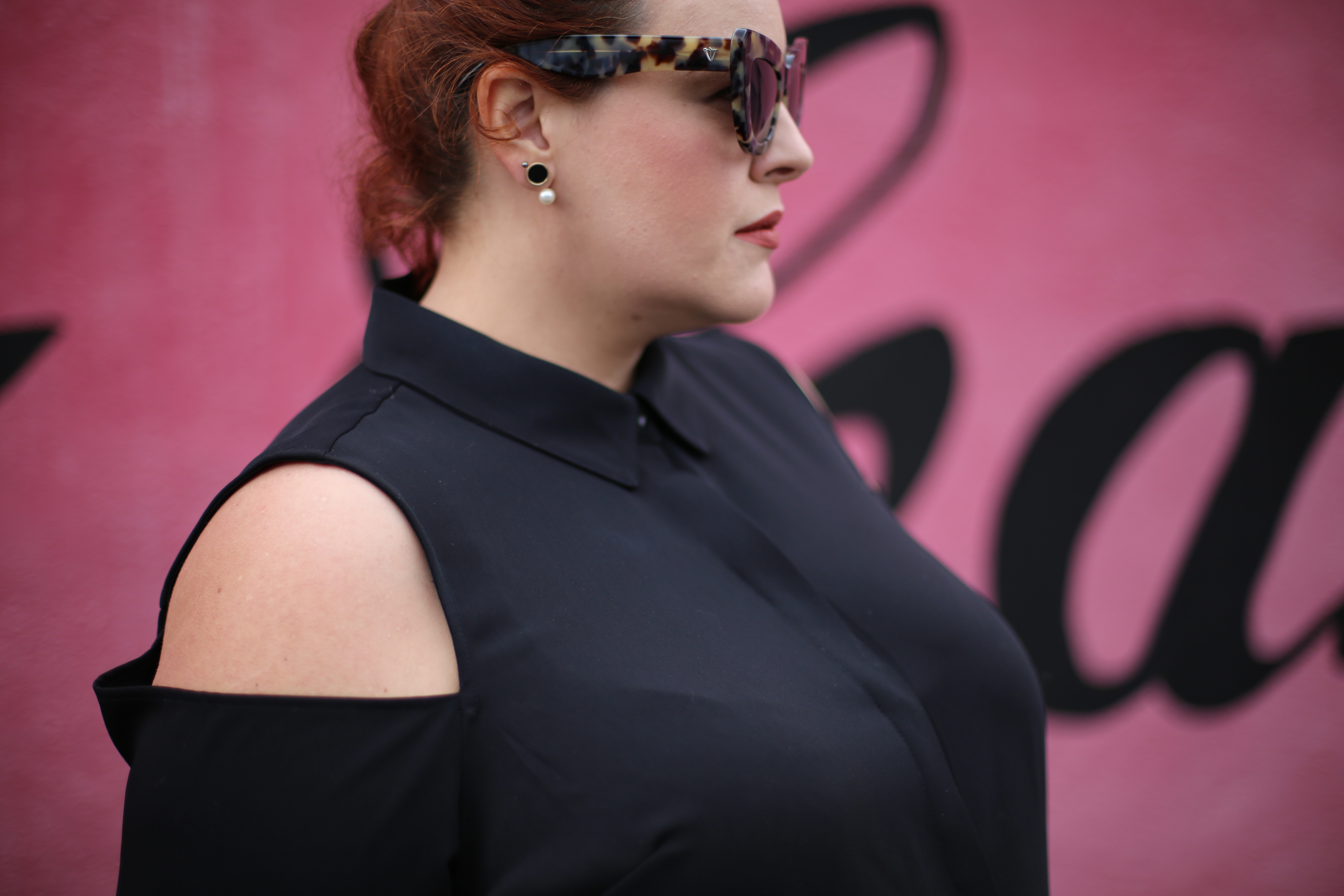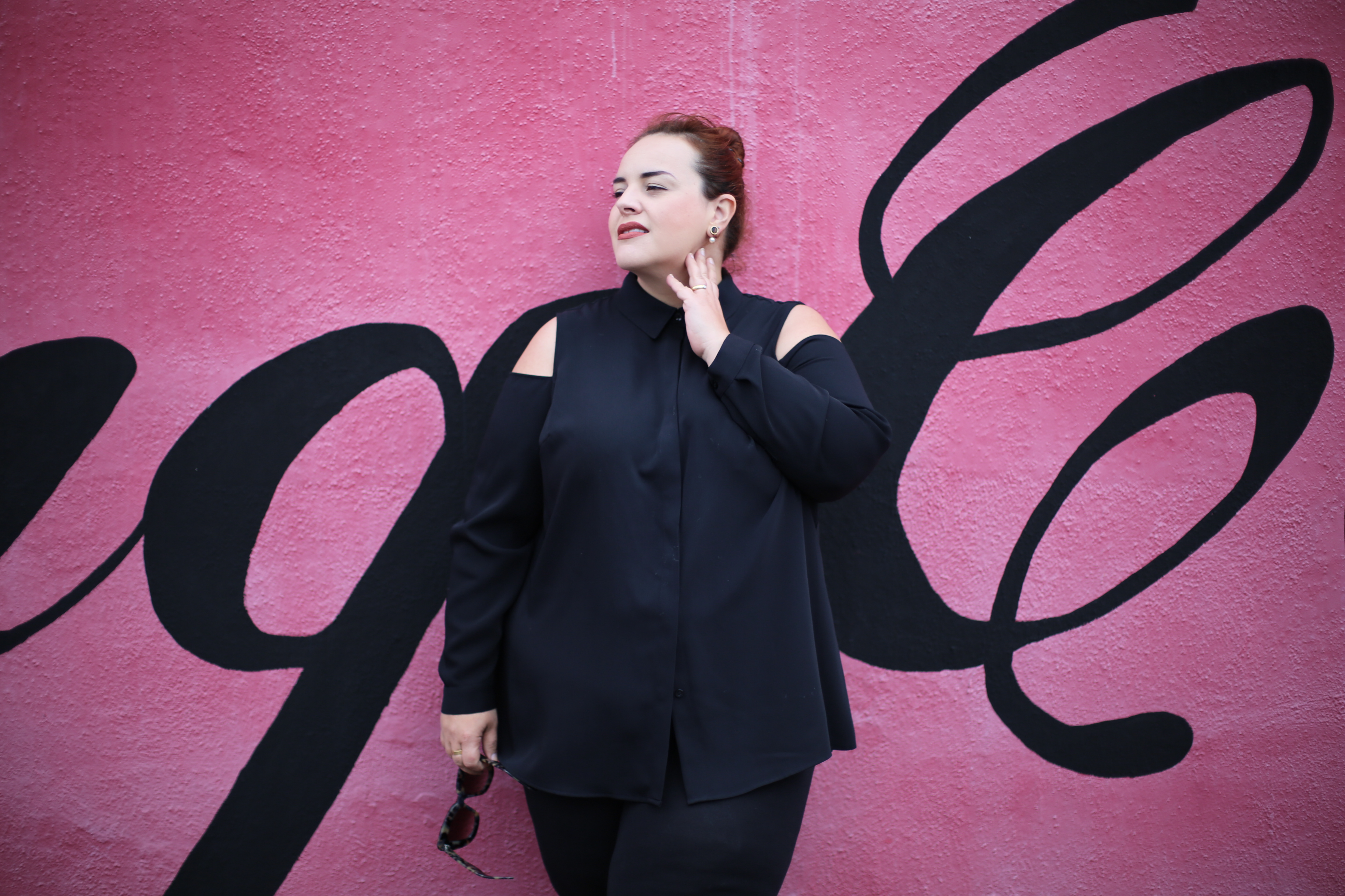 Ma tenue est ultra cool et confortable, forcément pour prendre l’avion. Un legging très doux de chez Asos Curve et un chemisier noir aux épaules ouvertes.