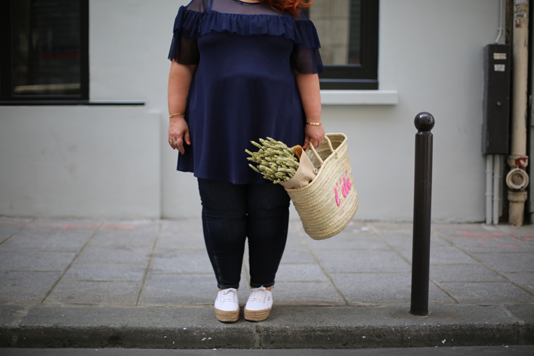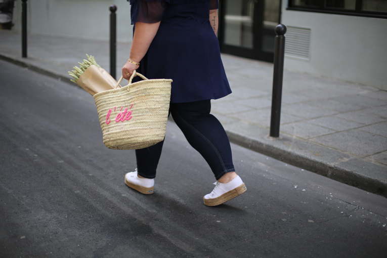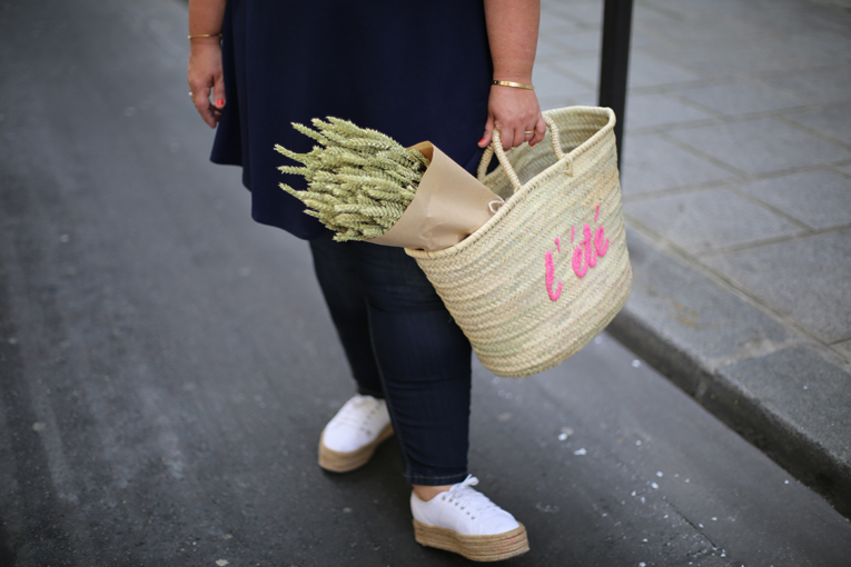 A mon bras le panier Sézane qui était offert en cadeau fin de la semaine dernière, il vient agrandir ma collection de panier d’été.