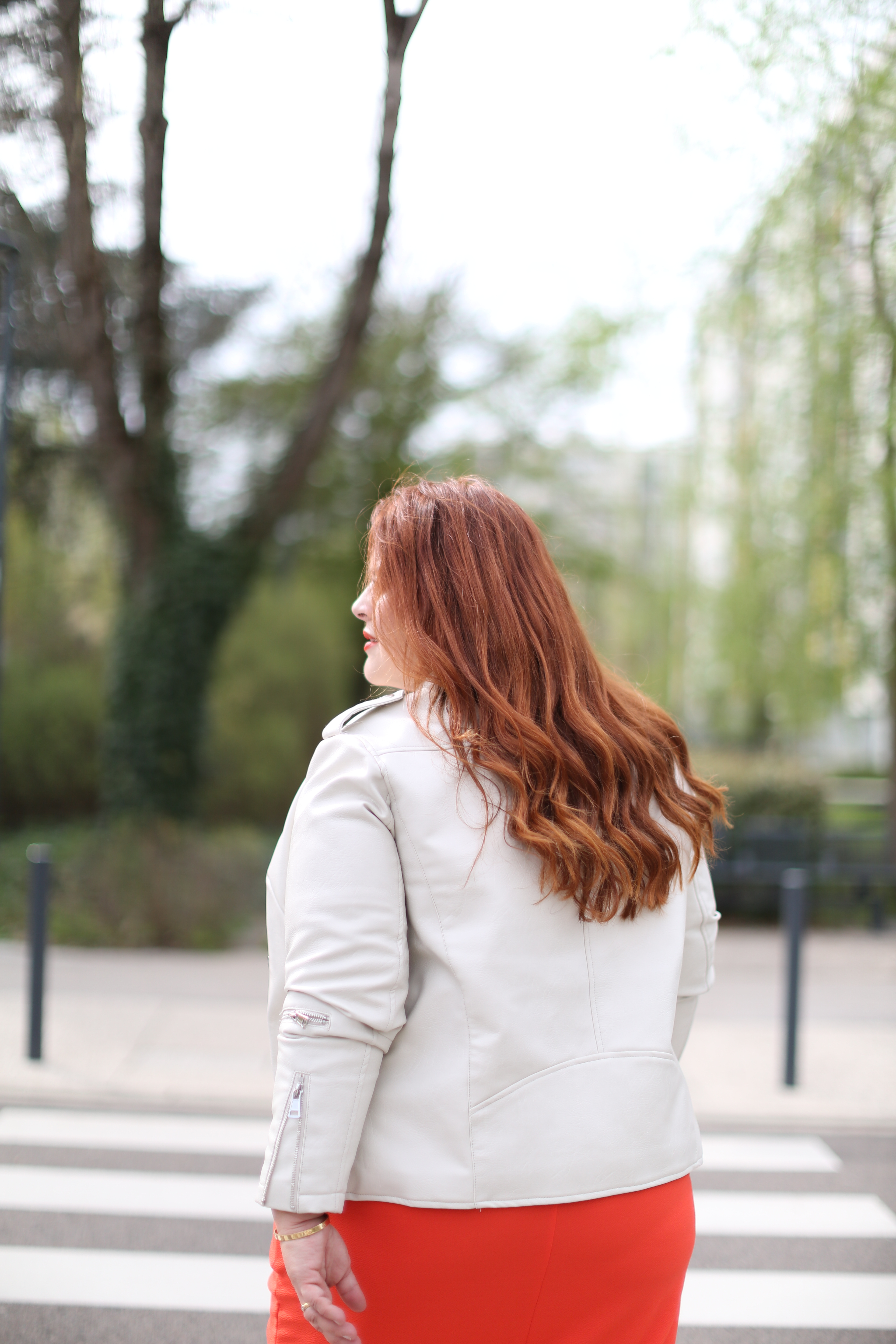 Sur mes épaules un perfecto blanc. J’en cherchais un comme celui-là depuis très longtemps, je ne l’ai pas trouvé en cuir, et si je pouvais avoir sa réplique qui ne me file pas d’allergie ça serait parfait (je suis allergique au simili). Mais en attendant je profite de cette beauté de perfecto, ma veste préférée pour le printemps.