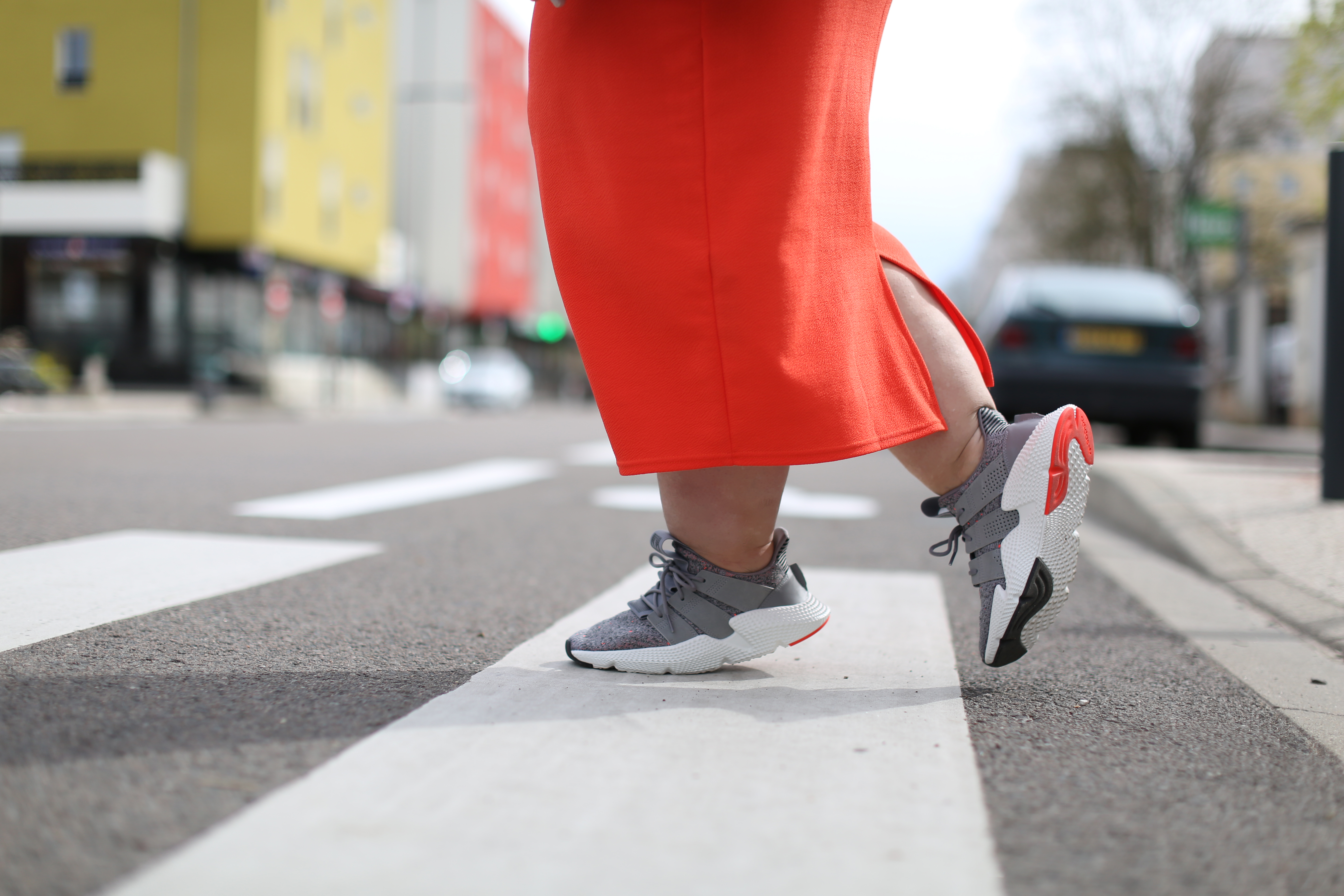 Pour casser le côté très habillé de la robe, j’ai choisi de porter des baskets Adidas Prophere en collaboration avec SCH (c’est un rappeur que je ne connaissais pas avant, j’avoue), le orange de la semelle s’accorde à ma robe. J’aime bien ce petit rappel de couleur. Elles sont disponibles sur le site Footlocker.fr