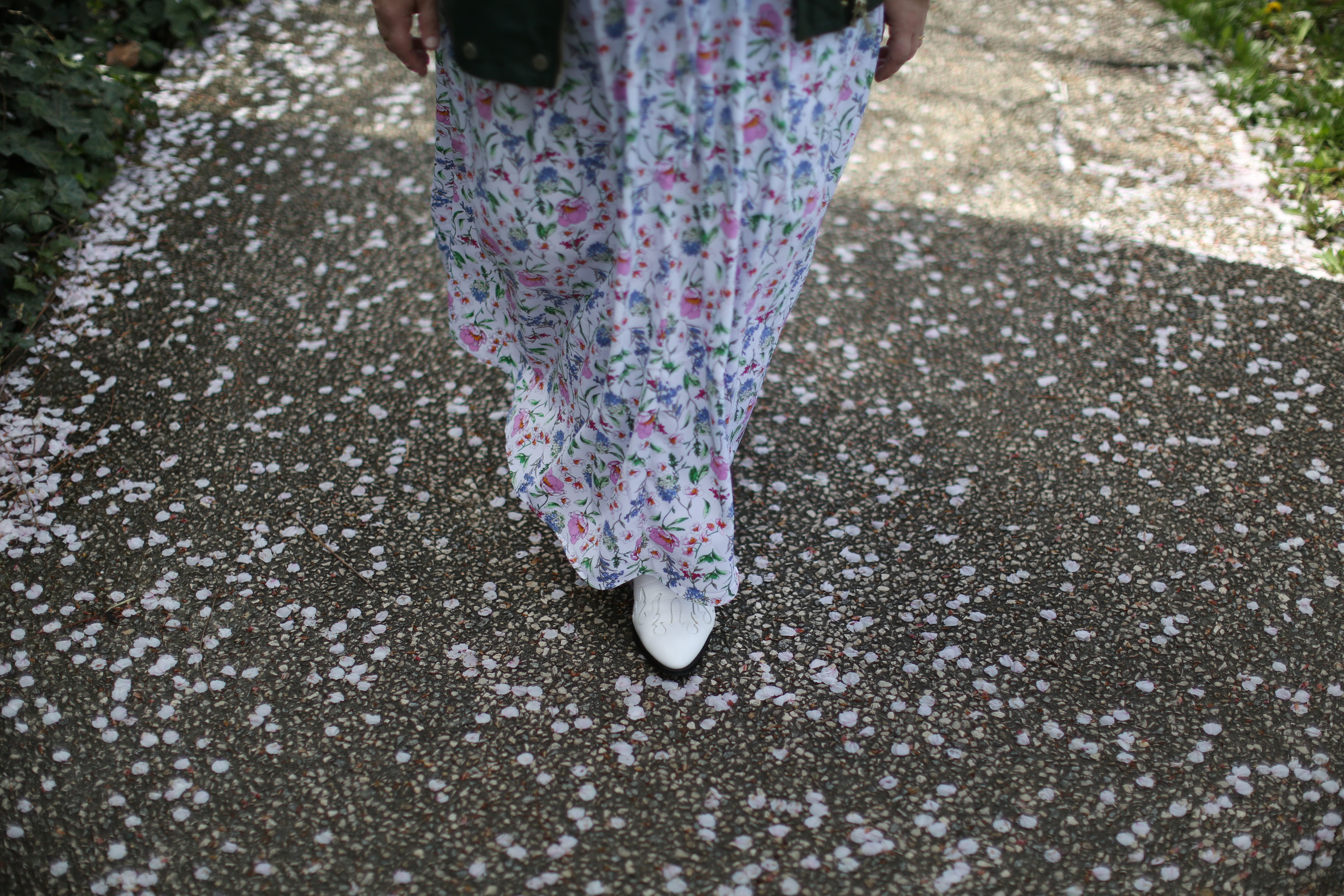 C’est une variation cuir et petites fleurs que je portais ce jour-là avec une touche de rock avec mes mini santiags fétiches. Un petit rêve d’ado que j’ai réalisé avec des santiags blanches. J’en voulais tellement, et je n’osais pas à l’époque, c’est au détour d’un shopping sur la toile que je suis tombée sur elles. Des merveilles que j’ai gardé aux pieds tout le week-end.