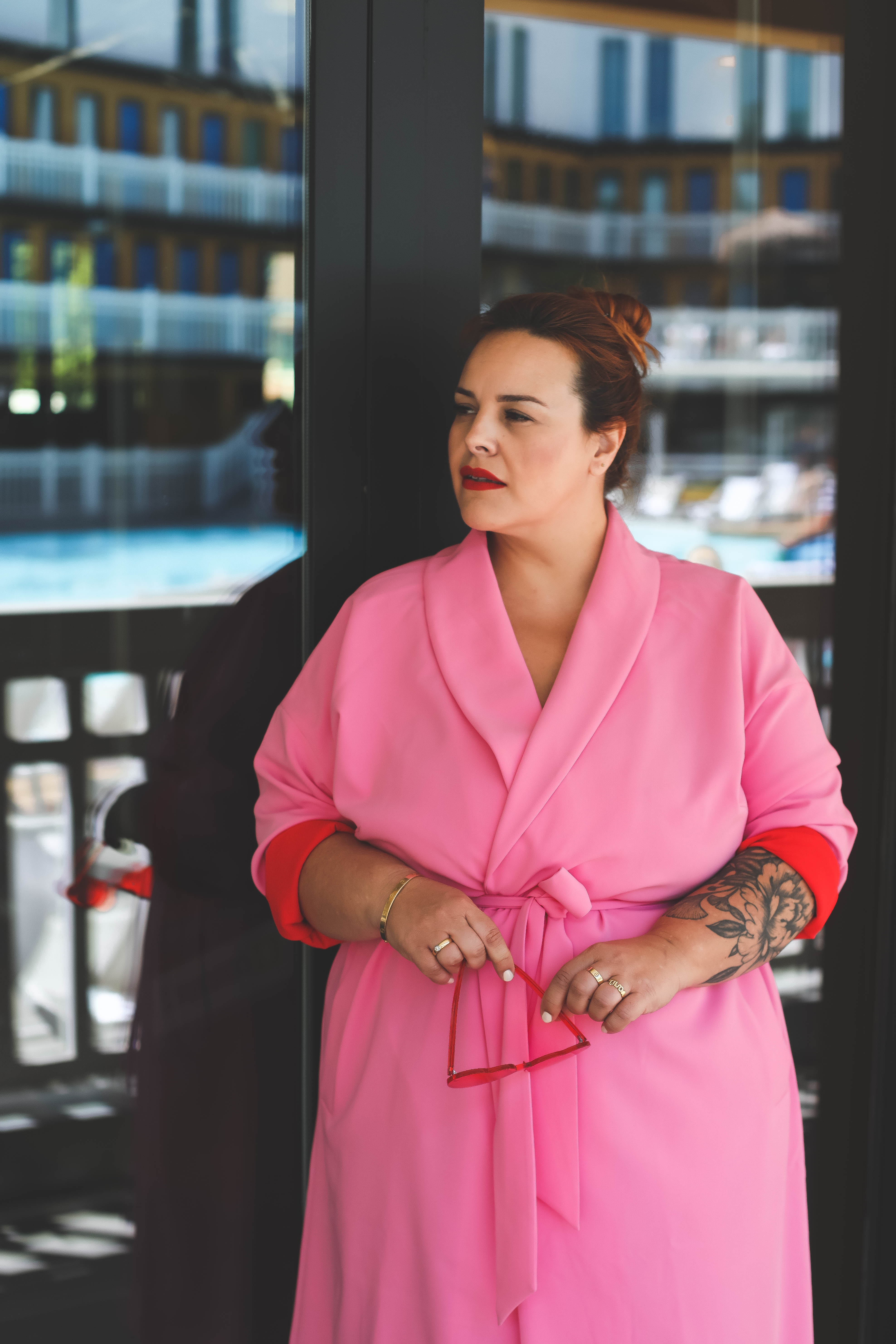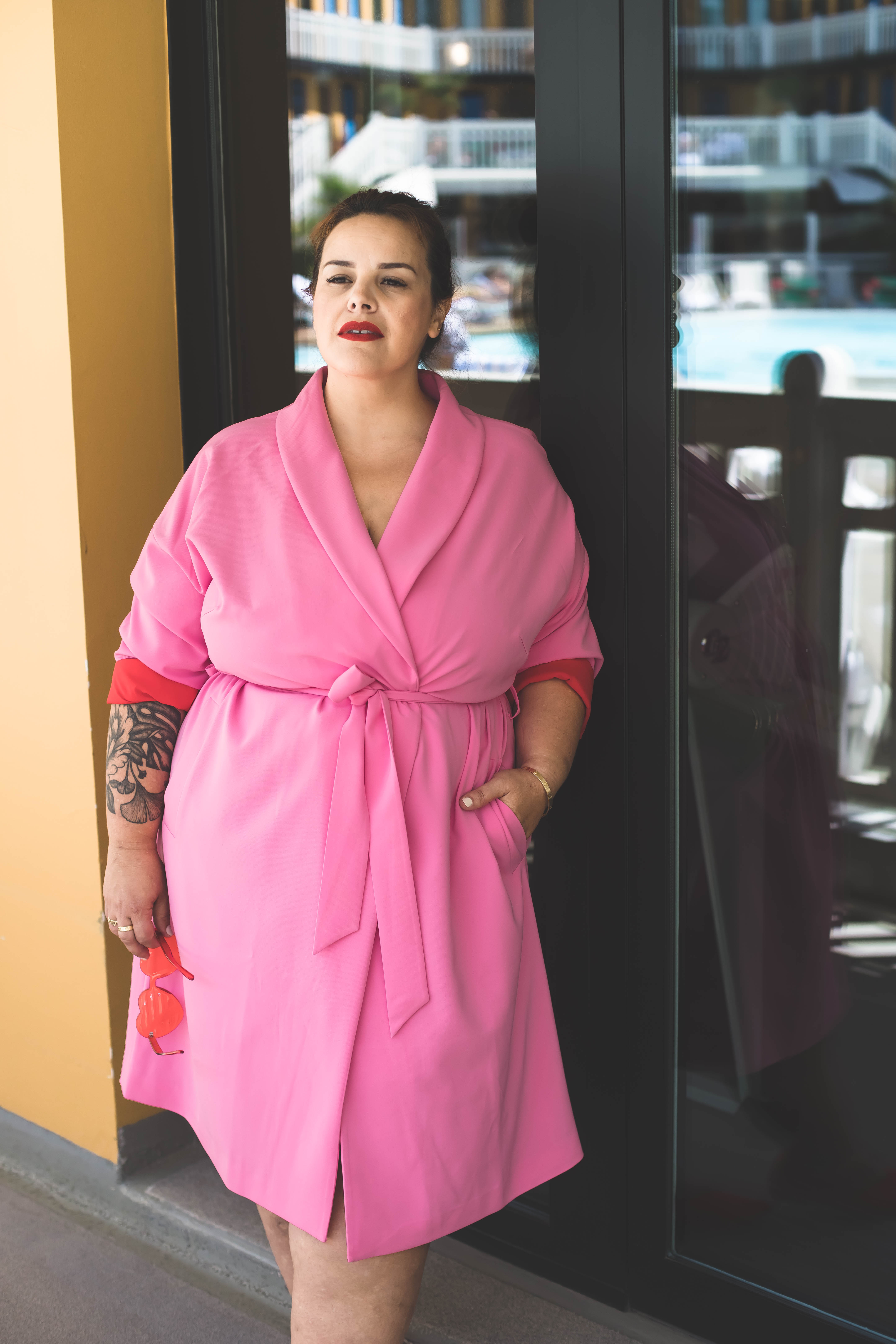 Déjà il mélange le rose et le rouge, association qui me transporte, allez comprendre, je trouve ça hyper joyeux et fou. Quand je l’ai essayé je me suis dit, tiens je le porterai bien en robe moi. Ceinturée, il se ferme parfaitement.