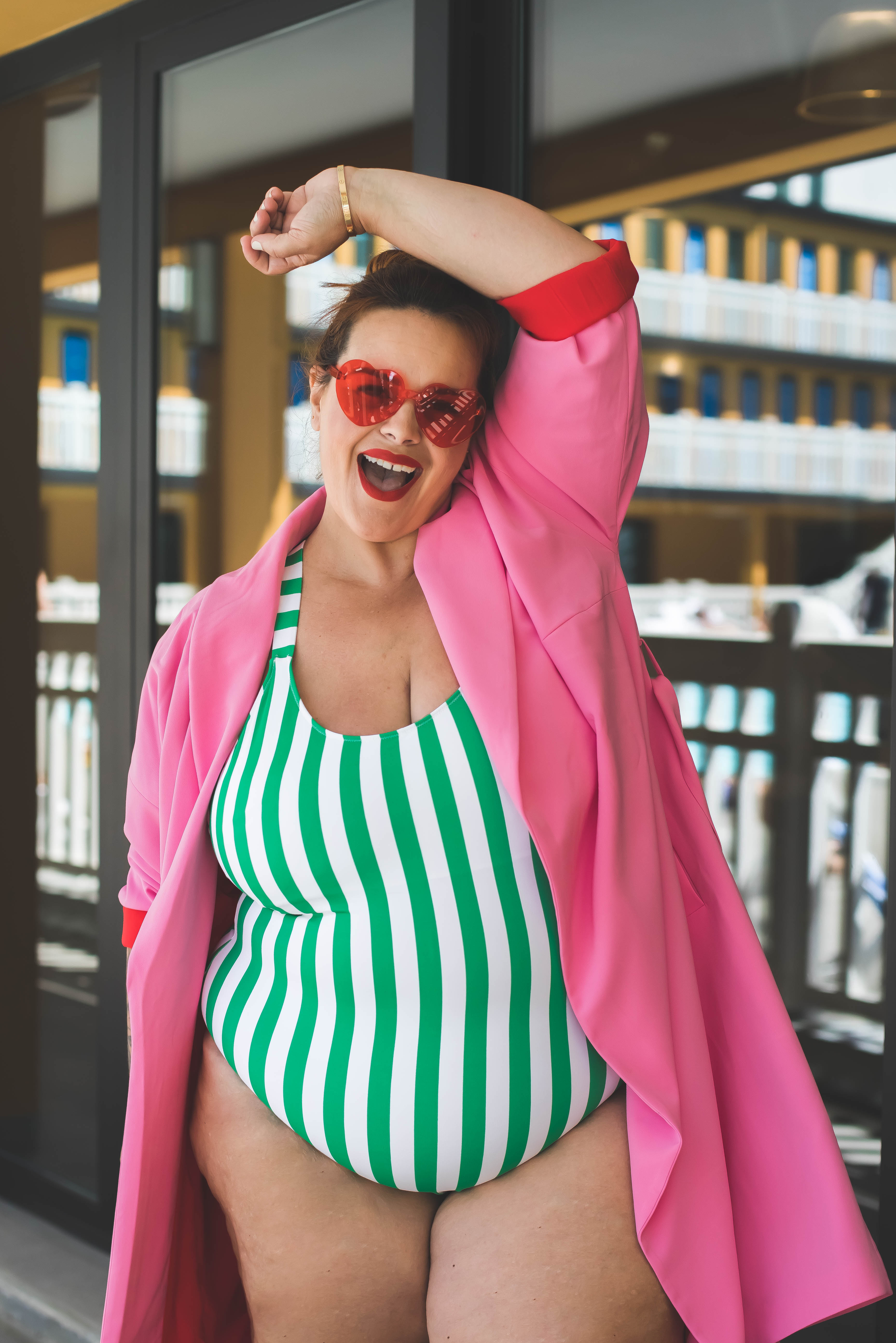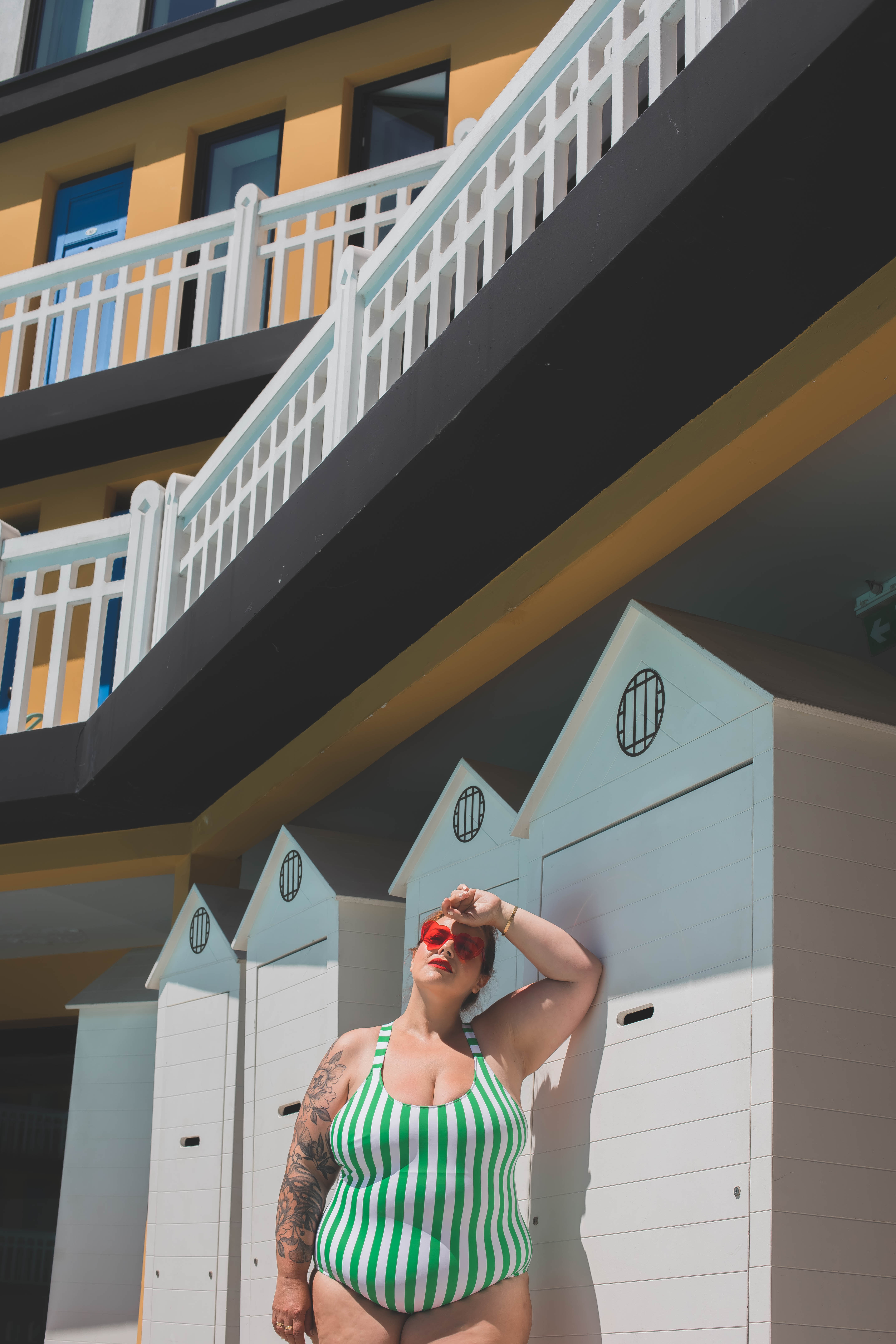 En dessous j’avais déjà passé mon maillot de bain pour éviter les changements pour le shooting. C’est en l’ouvrant que j’ai remarqué que les rayures vertes du maillot matchaient parfaitement bien avec mon manteau. Une sorte de fête foraine, la barbe à papa mélangée aux lollipos.